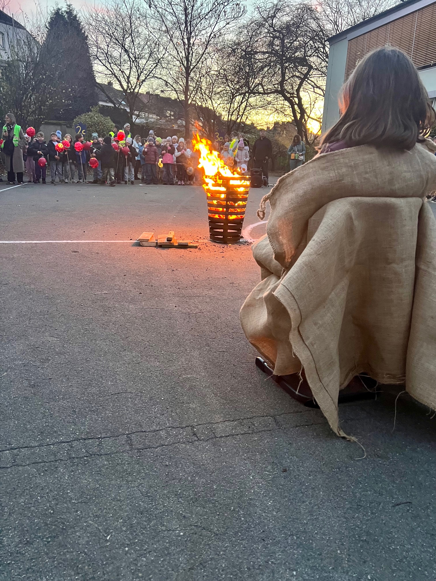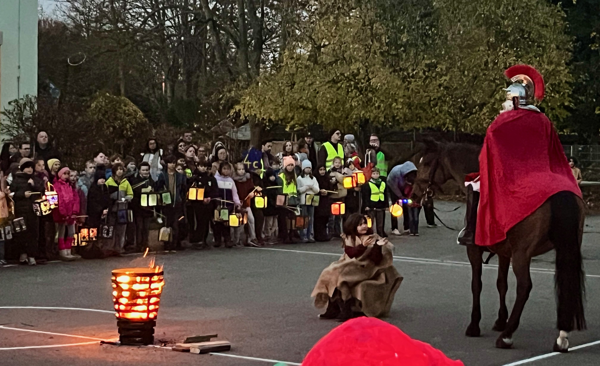 Im Vorfeld des Umzuges versammeln wir uns auf dem Schulhof, wo eine kleine Aufführung die Geschichte des heiligen Martin erzählt. Sie erinnert uns an die Werte des Teilens und der Nächstenliebe, die Sankt Martin durch das Teilen seines Mantels mit einem frierenden Bettler verkörpert. Den Abend lassen wir mit Glühwein, warmem Kinderpunsch, Würstchen, Weckmännern und selbstgebackenen Kuchen auf dem Schulhof ausklingen. Ein besonderer Dank geht an das Martinskommitee, welches die tolle Organsiation Jahr für Jahr übernimmt.